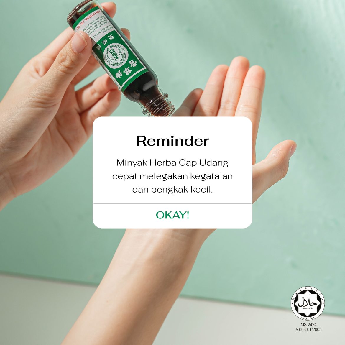 Gigitan serangga atau kegatalan kulit tak perlu risau lagi! Minyak Herba Cap Udang memberikan kelegaan pantas untuk kegatalan dan bengkak kecil, di mana sahaja anda berada. Simpan satu dalam beg anda untuk saat-saat memerlukan.