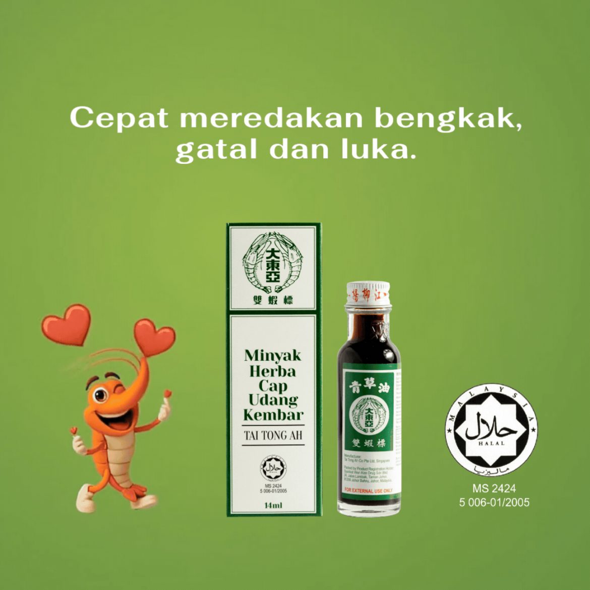 Minyak Herba Cap Udang telah dipercayai untuk memberikan kelegaan segera selama lebih 70 tahun. Dengan ramuan herba semula jadi, ia bersih, selamat dan juga Halal. Jadi gunakanlah dengan yakin.