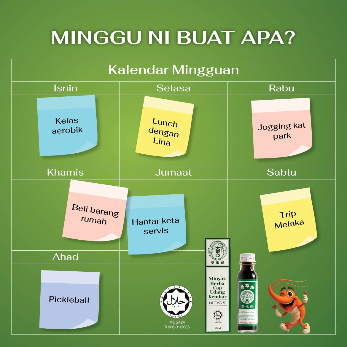 Apa pun plan, jangan lupa bawa sekali Minyak Herba Cap Udang bersama. Kebaikan semula jadi untuk melegakan gatal, luka dan bengkak, dipadatkan dalam satu botol kecil yang mudah dibawa.