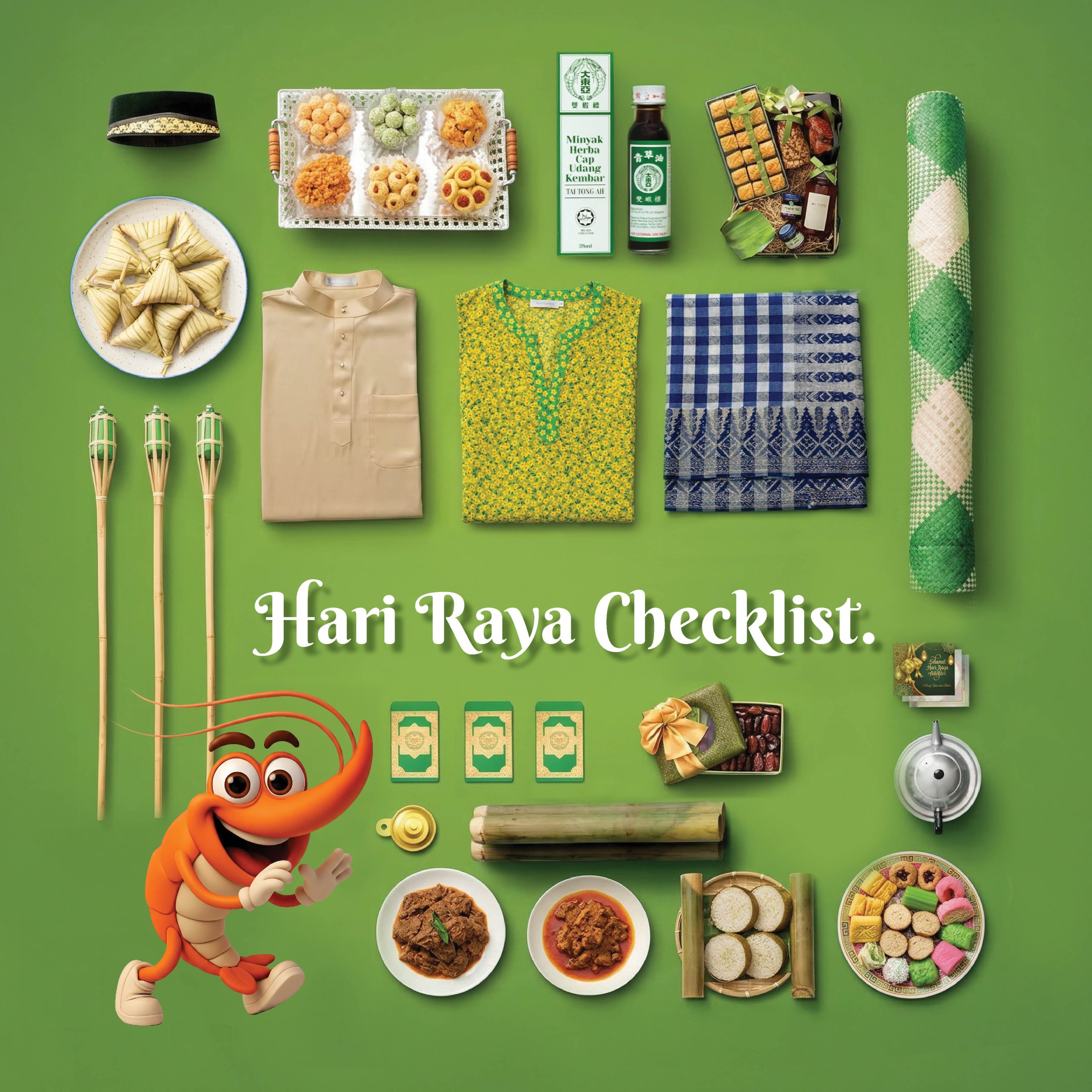 Musim Raya ni, jangan lupa pastikan Minyak Herba Cap Udang ada bersama tau. Mana la tau, dalam berseronok tu, mungkin kena gigit serangga, terluka atau bengkak. Boleh sapu sikit, terus lega. Selamat Hari Raya Aidilfitri.